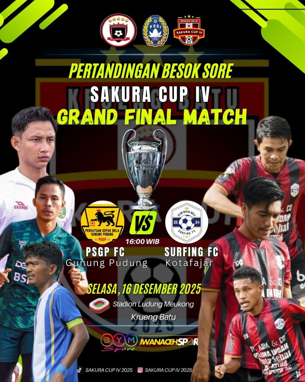 SikatKasus.News, Aceh Selatan — Turnamen Sakura Cup IV akhirnya tiba di puncaknya. Besok sore, Selasa 16 Desember 2025, Stadion Ludung Mekong Krueng Batu akan menjadi panggung pertarungan paling menentukan musim ini saat PSGP FC berhadapan dengan Surfing FC dalam laga gran final hidup–mati yang dinanti ribuan pecinta sepak bola.