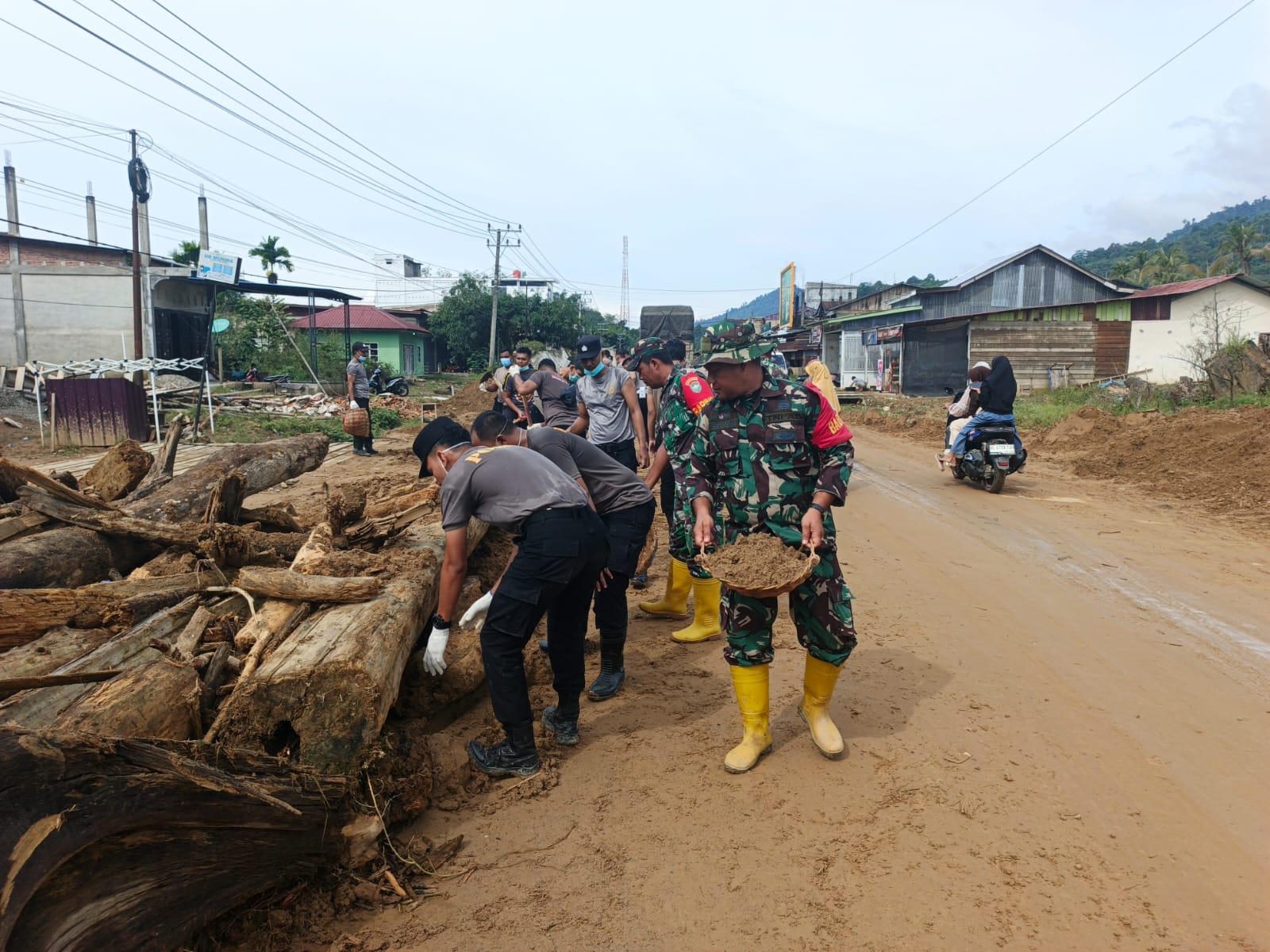 Dengan semangat gotong royong, prajurit TNI bahu-membahu membersihkan lumpur, menyingkirkan kayu yang menghalangi akses jalan, serta menormalisasi saluran drainase dan lingkungan permukiman warga.
