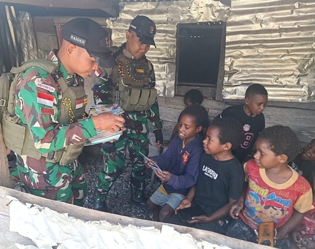 www.SikatKasus.news | Puncak Jaya – Prajurit Satgas Yonif 112/DJ Pos Puncak Senyum menjadi tenaga pendidik bagi anak-anak Papua dalam bentuk Kegiatan Belajar Mengajar dan membagikan buku dan alat tulis untuk sarana belajar di Kampung Yarmukum Distrik Puncak Senyum Kabupaten Puncak Jaya Provinsi Papua Tengah, Kamis (02/10/2025).