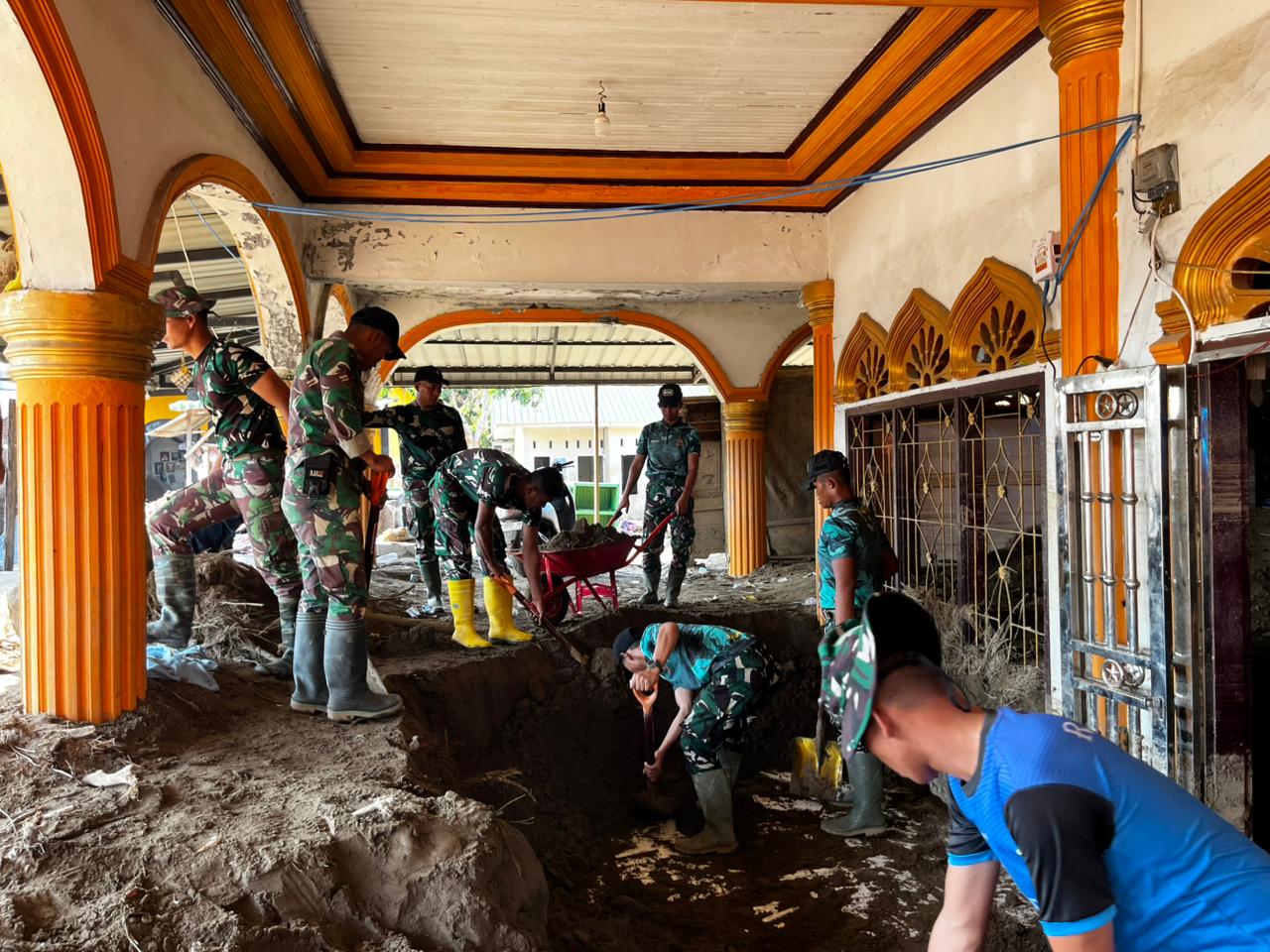 Meski dihadapkan dengan lumpur tebal yang telah mengendap dan mengeras, semangat para prajurit Yonarmed 17/RC tidak surut. Dengan penuh keikhlasan dan kebersamaan, para prajurit bahu-membahu membersihkan lumpur yang menutupi lantai, dinding, serta lingkungan sekitar meunasah.