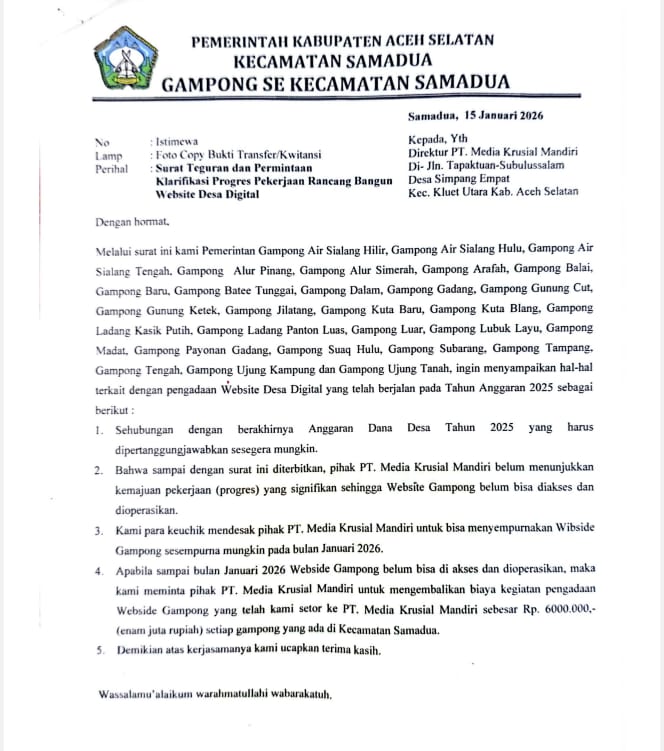 SikatKasus.News, Aceh Selatan – Sebanyak 28 Gampong tergabung dalam lingkup Kecamatan Samadua, Kabupaten Aceh Selatan, secara resmi melayangkan surat teguran dan permintaan klarifikasi kepada PT. Media Krusial Mandiri. Langkah tegas ini diambil menyusul mandeknya proyek pengadaan Website Desa Digital yang telah dianggarkan melalui Dana Desa Tahun Anggaran 2025.