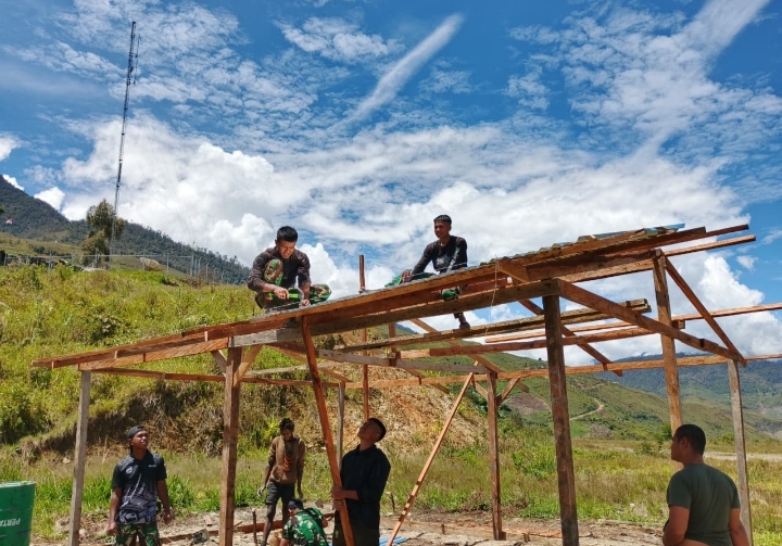 www.Sikatkasus.news | Puncak Jaya – Dalam semangat kebersamaan dan gotong royong, Satgas Batalyon Infanteri 112/Dharma Jaya melaksanakan kerja bakti bersama masyarakat membangun Aula Gereja secara Swadaya di Kampung Kalome, Distrik Tinggi Nambut, Kabupaten Puncak Jaya, Provinsi Papua Tengah Sabtu (18/10/2025).