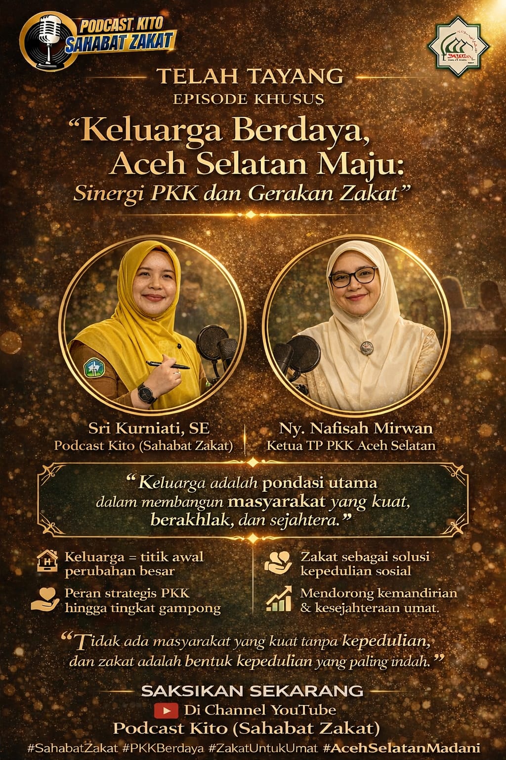 Pesan inilah yang mengemuka dalam Episode Khusus Podcast Kito – Sahabat Zakat Baitul Mal Kabupaten Aceh Selatan bertajuk “Keluarga Berdaya, Aceh Selatan Maju: Sinergi PKK dan Gerakan Zakat” yang tayang di Channel YouTube Podcast Kito (Sahabat Zakat), Jumat 17 April 2026, pukul 20.00 WIB.